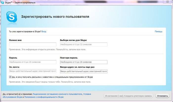 После установки инструмента скайп предложит вам сразу же зарегистрироваться в сервере. Для этого вы выбираете самое удобное имя в сети, а также пароль для доступа.