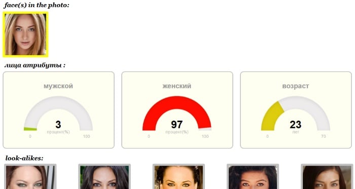 После загрузки своего изображения вы увидите ниже список из знаменитостей, на которых вы похожи. Они сортируются по схожести, начиная с первого изображения. Схожесть можно найти под изображениями, она выводится в процентах. Также под изображениями находятся имена знаменитостей. Под вашим изображением находятся 3 блока. Первый определяет схожесть лица на изображении с мужскими чертами, второй — с женскими, а третий определяет возраст человека на фотографии.