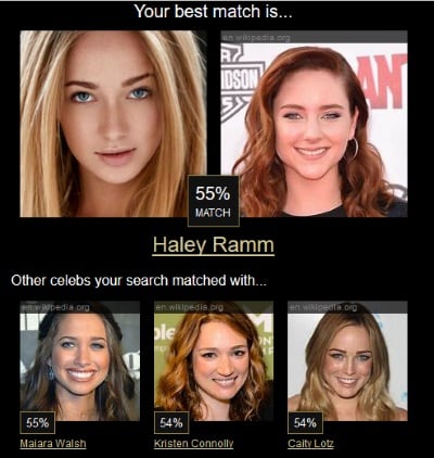 Результаты поиска похожих звезд - Схожесть определяется в процентах. Их можно заметить между вашим изображением и схожей звезды. Ниже находятся другие популярные личности, которые также имеют сходство с вами, но с меньшим процентом совпадения черт лица.