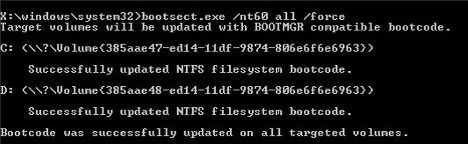Во-первых, вы должны очистить Master Boot Record (MBR) с помощью bootrec /fixmbr. Затем введите bootsect.exe /nt60 all /force и нажмите Enter. Параметр /nt60 применяет основной загрузочный код, совместимый с BOOTMGR. Параметр /all обновляет основной загрузочный код на всех разделах. Параметр /force принудительно отключает том(а) во время обновления загрузочного кода.