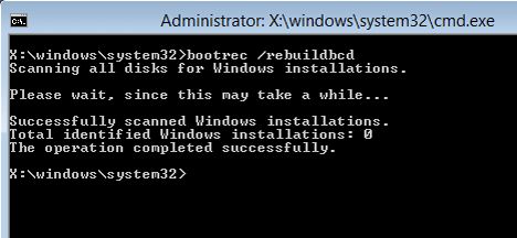 Чтобы полностью восстановить Boot Configuration Data, выполните следующую команду: bootrec.exe /rebuildbcd.
