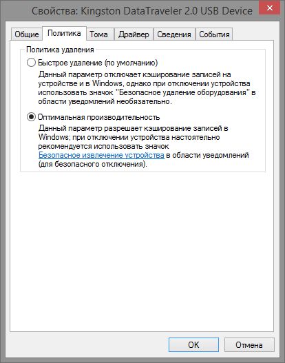 Для всех USB-накопителей операционная система Windows по умолчанию использует политику «Быстрое удаление». В этом режиме отключается кэширование записей, что замедляет скорость передачи данных, но позволяет извлекать устройство без использования функции «Безопасное извлечение устройства».