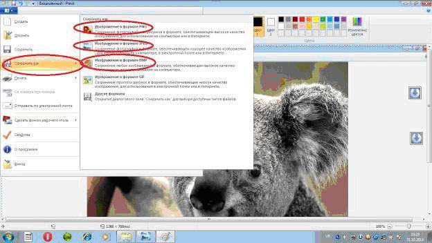 - в меню надо нажать «Сохранить как». В появившемся справа поле, можно выбрать из списка формат: PNG, JPEG, BMP, GIF;