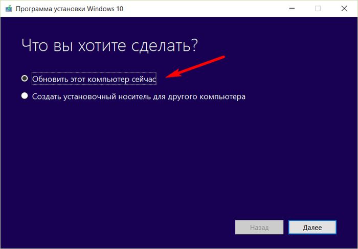 После запуска скачанной утилиты вы увидите лишь два возможных варианта дальнейших действий. Первый вариант – это запуск обновления текущей версии Windows 7 или 8.1 до версии 10. Вторым вариантом является процесс создания установочного носителя с Windows 10 для установки операционной системы с нуля.