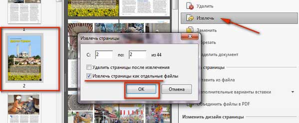 3. В открывшейся панели укажите диапазон извлекаемых страниц (если она одна — укажите её номер дважды: в первом и втором окошке). Включите опцию «Извлечь страницы как… ». Нажмите «OK».