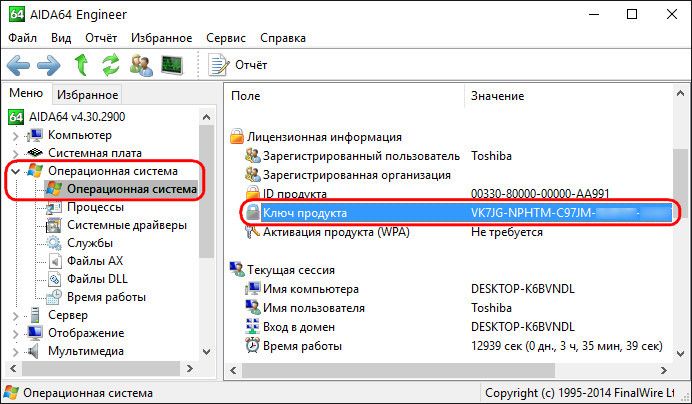 Ключ активации установленной Windows можно увидеть в различных программах для диагностики системных и аппаратных ресурсов компьютера. Например, в популярной программе AIDA64 ключ продукта Windows указывается в разделе «Операционная система», в подразделе с этим же названием.