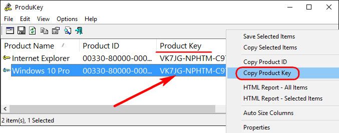 После распаковки архива и запуска EXE-файла в окне программки увидим, в частности, ключ активации установленной Windows. Кликаем строку с этим ключом, вызываем контекстное меню и выбираем «Copy Product Key».