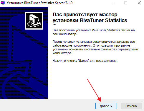 После завершения установки MSI Afterburner появится окно установщика RivaTuner Statistics Server.