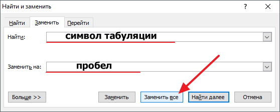Если в тексте много символов табуляции, то вы можете сэкономить время и заменить их на обычные пробелы с помощью поиска. Для этого скопируйте один из символов табуляции и нажмите комбинацию клавиш CTRL+H. В появившемся окне вставьте скопированный символ табуляции в поле «Найти» и обычный пробел в поле «Заменить на», после чего нажмите на кнопку «Заменить все».