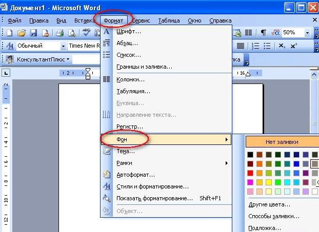 А в Word 2003 нужно будет открыть меню «Формат – Фон» и потом точно также выбрать вариант «Нет цвета».