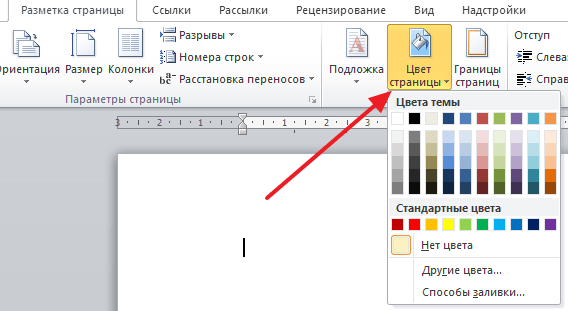 В Word 2007 и более современных версиях Word, смена цвета фона страницы делается немного по-другому. Здесь для того чтобы сделать фон страницы не белым, а, например, красным, нужно перейти на вкладку «Разметка страницы» и нажать на кнопку «Цвет страницы». После нажатия на данную кнопку откроется небольшое меню со списком стандартных цветов для фона страницы.