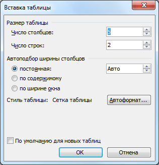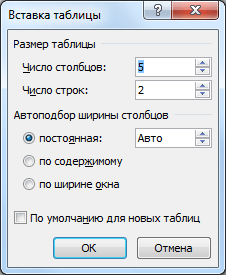 После этого появится небольшое окно для выбора количества столбцов, строк и настройки автоматического подбора ширины столбцов. После внесения всех настроек нужно нажать на кнопку «OK» и таблица появится в документе.