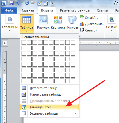 Соседняя кнопка позволяет сделать таблицу Excel внутри документа Word.