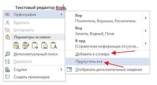 Здесь будет доступно два варианта: «Добавить в словарь» и «Пропустить все». Если выбрать первый вариант, то слово будет добавлено в словарь и после этого больше не будет подчеркиваться красной линией как ошибочное, а если выбрать второй вариант, то Ворд просто пропустит эту ошибку.