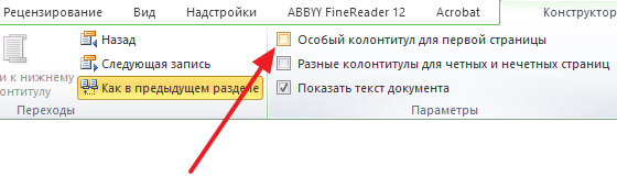 Иногда возникает необходимость удалить колонтитулы только с первой страницы. Сделать это достаточно просто. Для этого кликните мышкой два раза по колонтитулу на первой странице и перейдите на вкладку «Конструктор». Здесь нужно установить отметку напротив функции «Особый колонтитул для первой страницы».