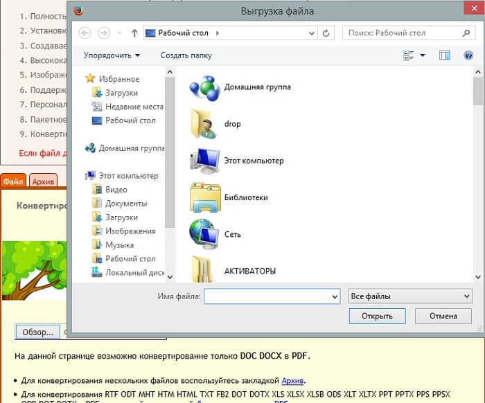 - Далее в окне ниже выберите PDF в DOCX. После этого откроется файловая система вашего ПК.