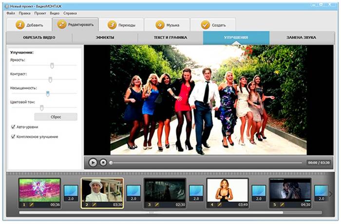 В ВидеоМОНТАЖ встроены полноценные инструменты для редактирование видеороликов: цветокорекция изображения, эффекты перехода, обрезка видео и другие.