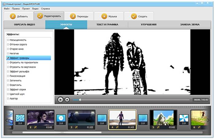 - далее откроется окно с выбором различных эффектов: «Старое кино», «негатив», «эффект гравюры» и другие.