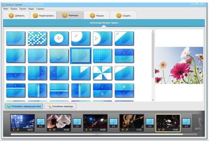 - в программе присутствует широкий выбор различных эффектов и переходов;