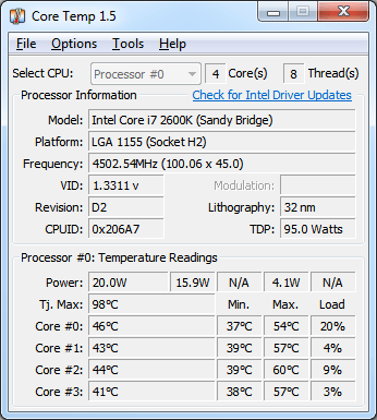 Кроме температуры с помощью Core Temp можно узнать напряжение на процессор, потребление энергии процессором, а также все основные характеристики процессора (модель процессора, платформа, тактовая частота, количество ядер, техпроцесс и т.д.).