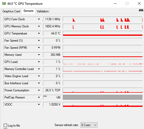 Для того чтобы измерить температуру видеокарты, после запуска нужно просто перейти на вкладку «Sensors» и наблюдать за параметром «Temperature». При необходимости температуру видеокарты можно вывести в заголовок окна GPU-Z или в LOG-файл.