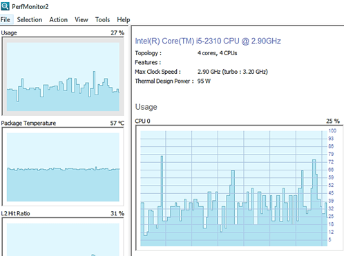 Perfmonitor 2 – еще одна бесплатная программа от компании CPUID. Perfmonitor 2 предназначен для измерения температуры процессора, а также для сбора других данных о его работе. Например, с помощью данной программы можно узнать нагрузку на процессор, а также количество выполненных инструкций на каждый ватт потраченной энергии.