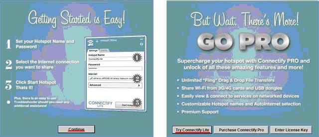 После перезагрузки появятся окно для настройки приложения. Нажимайте «Continue» и выберите «Try Connectify Lite» на следующем экране.