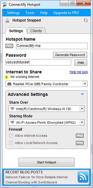 - HotSpot Name – это имя вашей точки доступа. Его изменение доступно только в платной версии программы. В бесплатной версии, оно значится, как Connectify-me. Если вы приобрели Pro-версию, то можете вписать свое название только английскими буквами или цифрами;