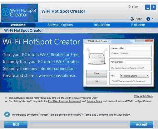 При установке Wi-Fi HotSpot Creator будьте внимательны, так как программа и предлагает загрузку ненужных вам дополнений. Некоторые антивирусы могут увидеть в приложении угрозу системе и заблокировать его.