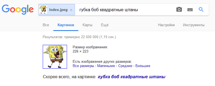 Пример поиска изображения губки боб в Google - Вы можете настроить выдачу результатов при помощи кнопок посередине «Настройки» и «Инструменты». Нажав «Инструменты» можно изменить вид поиска, вместо поиска по картинке система будет искать другие размеры с этим же содержанием.