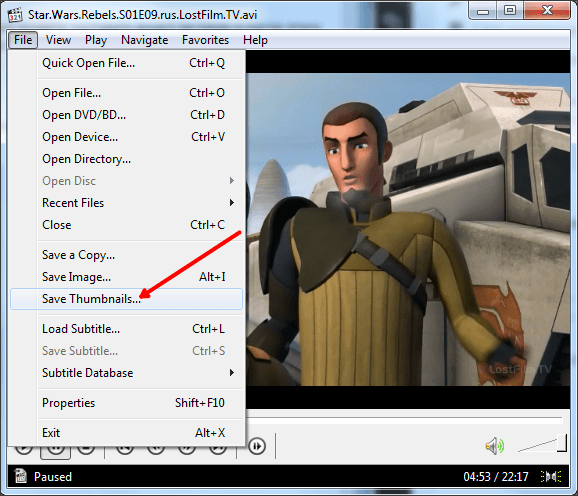 Кроме сохранения отдельного кадра, в Media Player Classic можно делать нарезку кадров из видео. Для этого откройте меню «File» и выберите пункт «Save Thumbnails».