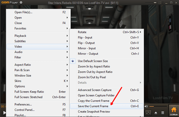 Если вы используете медиа проигрыватель GOMPlayer, то для того чтобы сохранить фото из видео вам необходимо кликнуть правой кнопкой по самому видео и в появившемся меню выбрать пункт «Video – Save the Current Frame». Также для этого вы можете воспользоваться комбинацией клавиш CTRL+E.