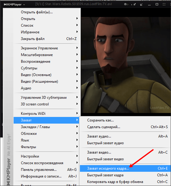 Если для просмотра видео вы используете KMPlayer, то для того чтобы сохранить кадр из видео вам необходимо кликнуть правой кнопкой по видео и открыть меню «Захват – Захват исходного кадра». После этого на экране появится окно, в котором нужно просто сохранить получившийся кадр в любую папку.