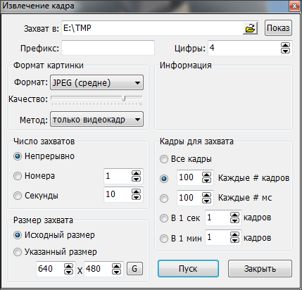 Также в KMPlayer есть функция под названием «Извлечения кадра», ее можно запустить при помощи меню «Захват» или с помощью комбинации клавиш CTRL+G. После запуска данной функции на экране появится небольшое окно, в котором можно настроить автоматическое сохранение кадров. Например, здесь можно настроить сохранение каждого сотого кадра или одного кадра в секунду.