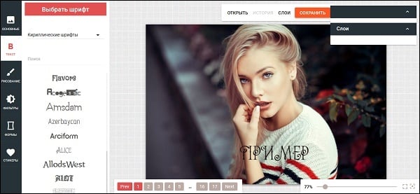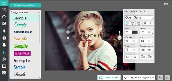 - Слева выберите понравившийся шрифт, в специальном поле на фото введите нужный текст, определитесь с другими настройками справа;