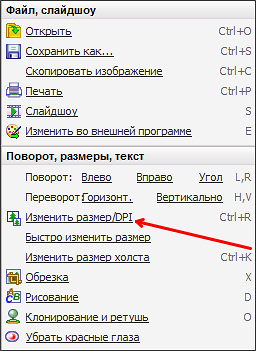 В этом меню нужно выбрать функцию «Изменить размер / DPI». С помощью данной функции можно сжать фотографию путем уменьшения ее разрешения.
