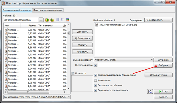 После того как вы указали все параметры нужно выбрать папку для сжатых фотографий. Для этого нажмите на кнопку «Выбрать».