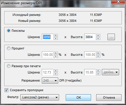 После этого перед вами должно открыться окно для изменения разрешения фотографии. Вы можете указать нужное вам разрешение в пикселях, процентах или количестве точек на дюйм (DPI).