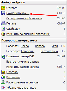 После того как мы уменьшили разрешение фотографии, можно приступать к сохранению файла с новыми настройками сжатия. Для этого откройте левое всплывающее меню и выберите «Сохранить как». Также вы можете воспользоваться комбинацией клавиш Ctrl+S.