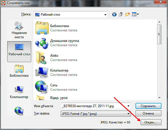После этого перед вами откроется окно сохранения файла. Для того чтобы сменить настройки сжатия фотографии нажмите на кнопку «Опции».