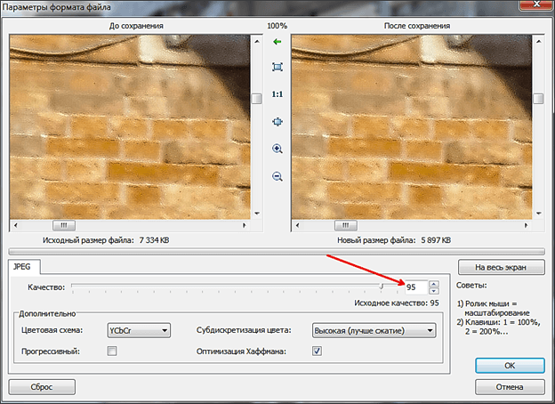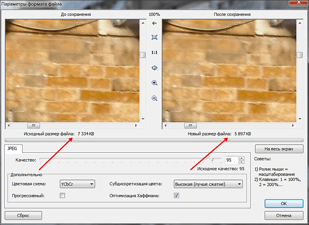 В верхней части окна будет показываться, как меняется качество картинки в зависимости от степени сжатия. Также здесь можно узнать, сколько будет весить файл после сохранения с такими настройками сжатия, а также, сколько он весил раньше.