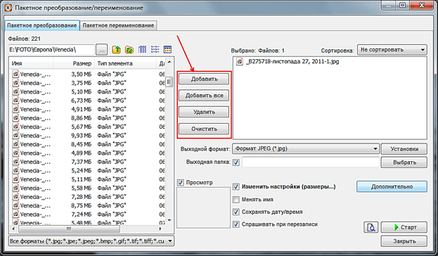 В окне «Пакетное преобразование» есть два списка файлов. В левой части окна список файлов в текущей папке, а в правой части окна список файлов на преобразование. Вы можете добавлять или удалять файлы, которые вы хотите сжать, с помощью кнопок, которые находятся между этими двумя списками.