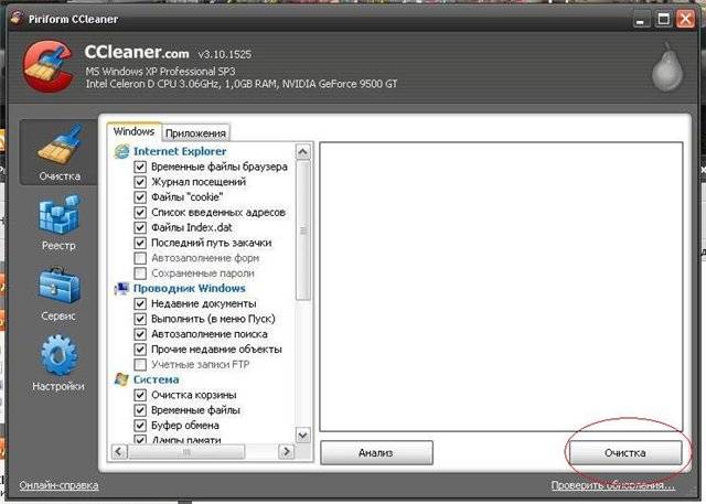 - нажатие на кнопку «Очистка» запускает, собственно, сам процесс
