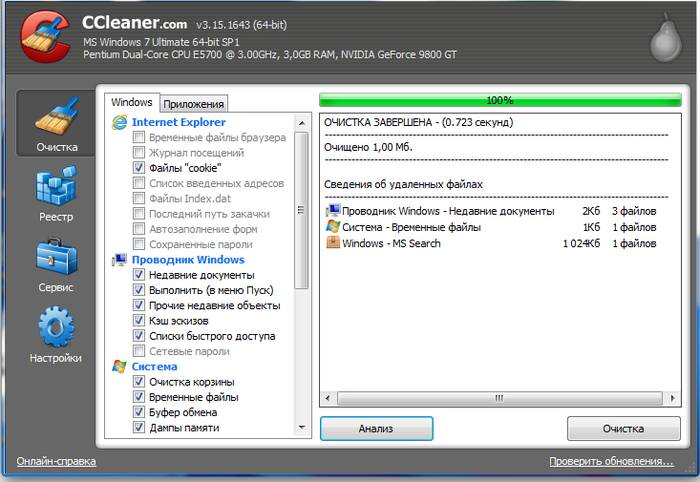 Быстрое очищение кэша компьютера с помощью CCleaner делается так: