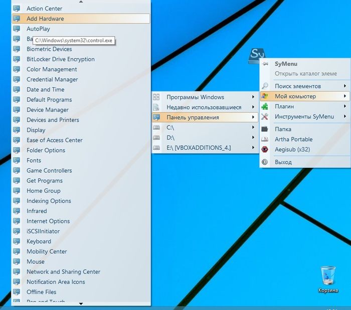 Слово «замена» мы взяли в кавычки, так как SyMenu не заменяет меню Пуск в полном смысле этого слова как это делают некоторые программы, а создает ему альтернативу. То есть после запуска программы вы сможете выбирать, каким меню пользоваться. SyMenu позволяет выполнять практически все те же действия, что и стандартное меню: запускать программы, в том числе портативные, открывать файлы и папки, получать доступ к апплетам Панели управления и другим объектам.
