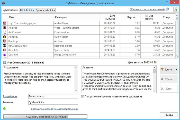 Но самой интересной особенностью приложения является наличие встроенного менеджера SPS для скачивания и установки портативных приложений из трех онлайновых репозиториев, причем все загруженные с его помощью программы автоматически прописываются в меню SyMenu. Аналогичную функцию выполняет встроенный плагин PAF program suite. Его также можно использовать для загрузки и установки бесплатного программного обеспечения из онлайновых хранилищ.
