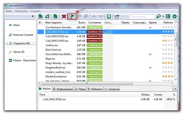 - Откройте программу. Войдите в страницу загрузок и найдите файл, на котором возникла ошибка. Обычно в клиентах он будет выделен красным цветом, означая, что файл не докачался.