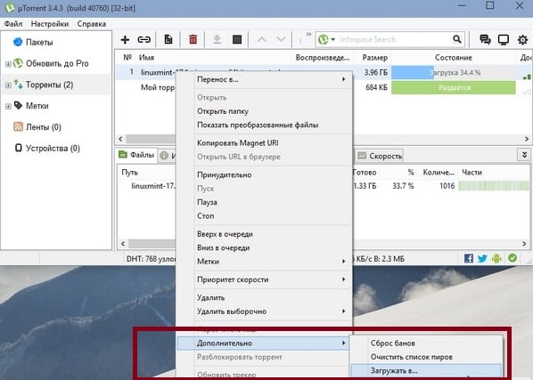 Недокаченный Торрент-файл - Нажмите на загрузку правой кнопкой мыши и выберите пункт из выпавшего меню «Дополнительно», «Загрузить в».