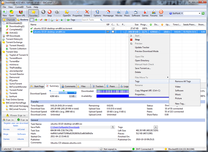 Программа BitComet умеет не только скачивать торренты, но и работать с загрузками практически любого типа. Если вам нужен менеджер загрузок с поддержкой торрентов то BitComet это неплохой выбор. Данная программа поддерживает загрузку по протоколам: HTTP (обычные прямые ссылки), FTP, eDonkey2000 и конечно же BitTorrent (торренты).