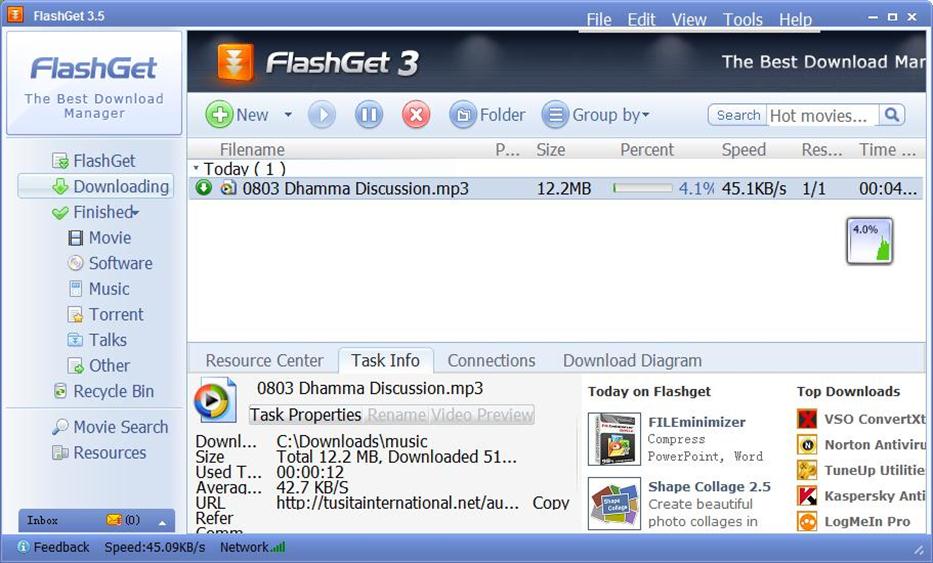 Кроме этого FlashGet поддерживает загрузку файлов по частям и загрузку с нескольких источников. Это позволяет значительно повысить скорость скачивания файлов.